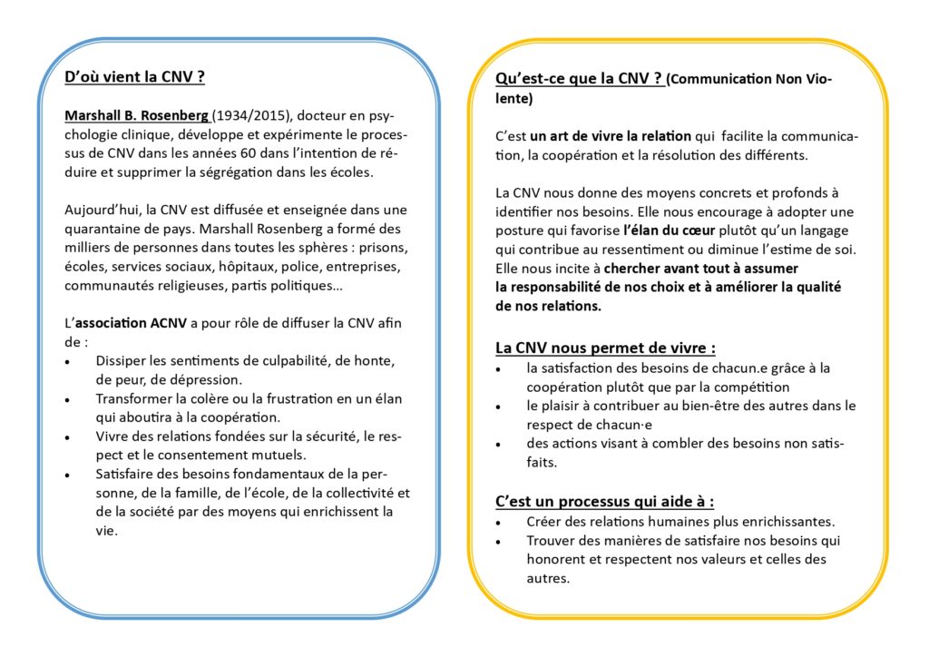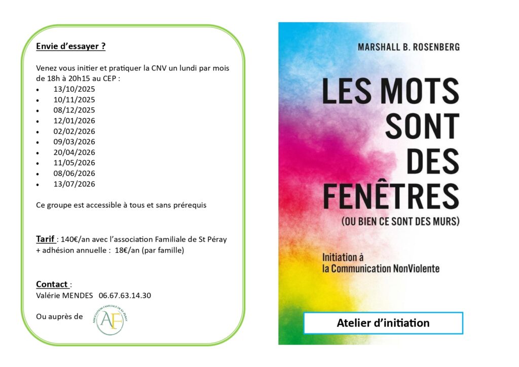 Communication non violente CNV Initiation à la CNV 1 Atelier par mois : Lundi 18h-20h15 140€* V. MENDES 06.67.63.14.30